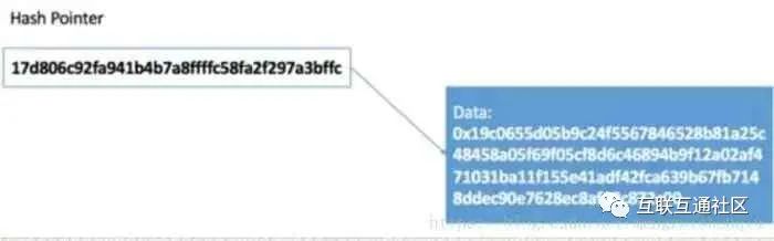 哈希在区块链中用处广泛,其一我们称之为哈希指针(Hash Pointer),哈希指针是指该变量的值是通过实际数据计算出来的且指向实际的数据所在位置,即其既可以表示实际数据内容又可以表示实际数据的存储位置。如下图所示: