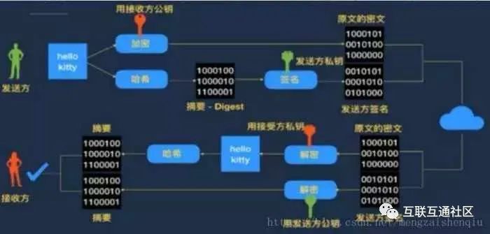 数字签名就是在信息后面加上另一段内容,作为发送者的证明并且证明信息没有被篡改。一般是发送者将信息用哈希算法处理得出一个哈希值,然后用私钥对该哈希值进行加密,得出一个签名。然后发送者再将信息和签名一起发送给接收者。接收者使用发送者的公钥对签名进行解密,还原出哈希值,再通过哈希算法来验证信息的哈希值和解密签名还原出来的哈希值是否一致,从而可以鉴定信息是否来自发送者或验证信息是否被篡,如下图所示。