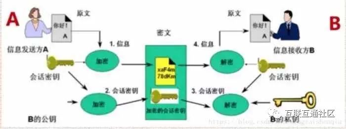 这种方式将加密过程分为两个阶段,阶段一使用非对称加密进行秘钥的分发使得对方安全地得到对称加密的秘钥,阶段二使用对称加密对原文进行加解密,如下图所示。