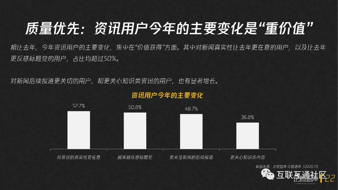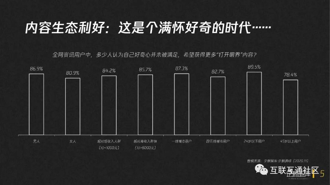 其实判断未来和变化并非无迹可寻。站在2020,望向2021,我们相信,用户正在更明确地关注增量信息,关注价值供应。那些海量的好奇心和打开眼界的渴望,将会把内容生态带向下一个黄金时代。