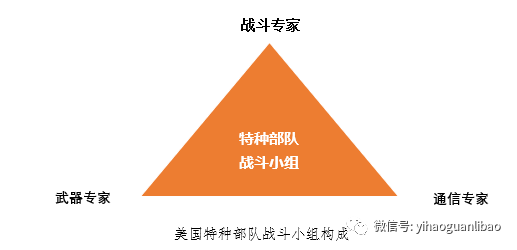 美国特种部队基本组织架构是三个人组成一个前端战斗执行小组, 形成战斗铁三角: