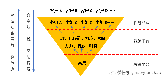 第二,打造“小前端+大后台”组织模式,实现了大后台对小前端的赋能,组织架构模式由金字塔型转变为倒三角型,实现了小前端能够呼唤后端炮火。