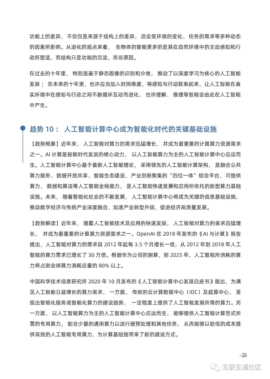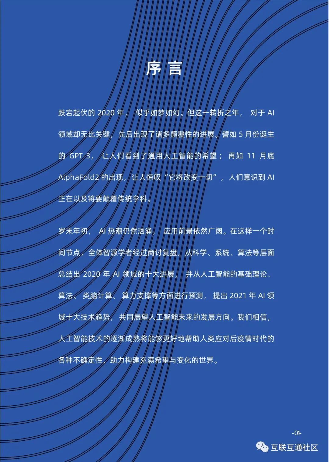 岁末年初, AI 热潮仍然汹涌, 应用前景依然广阔。在这样一个时 间节点,全体智源学者经过商讨复盘,从科学、系统、算法等层面 总结出 2020 年 AI 领域的十大进展, 并从人工智能的基础理论、 算法、 类脑计算、 算力支撑等方面进行预测, 提出 2021 年 AI 领 域十大技术趋势, 共同展望人工智能未来的发展方向。我们相信, 人工智能技术的逐渐成熟将能够更好地帮助人类应对后疫情时代的 各种不确定性,助力构建充满希望与变化的世界。