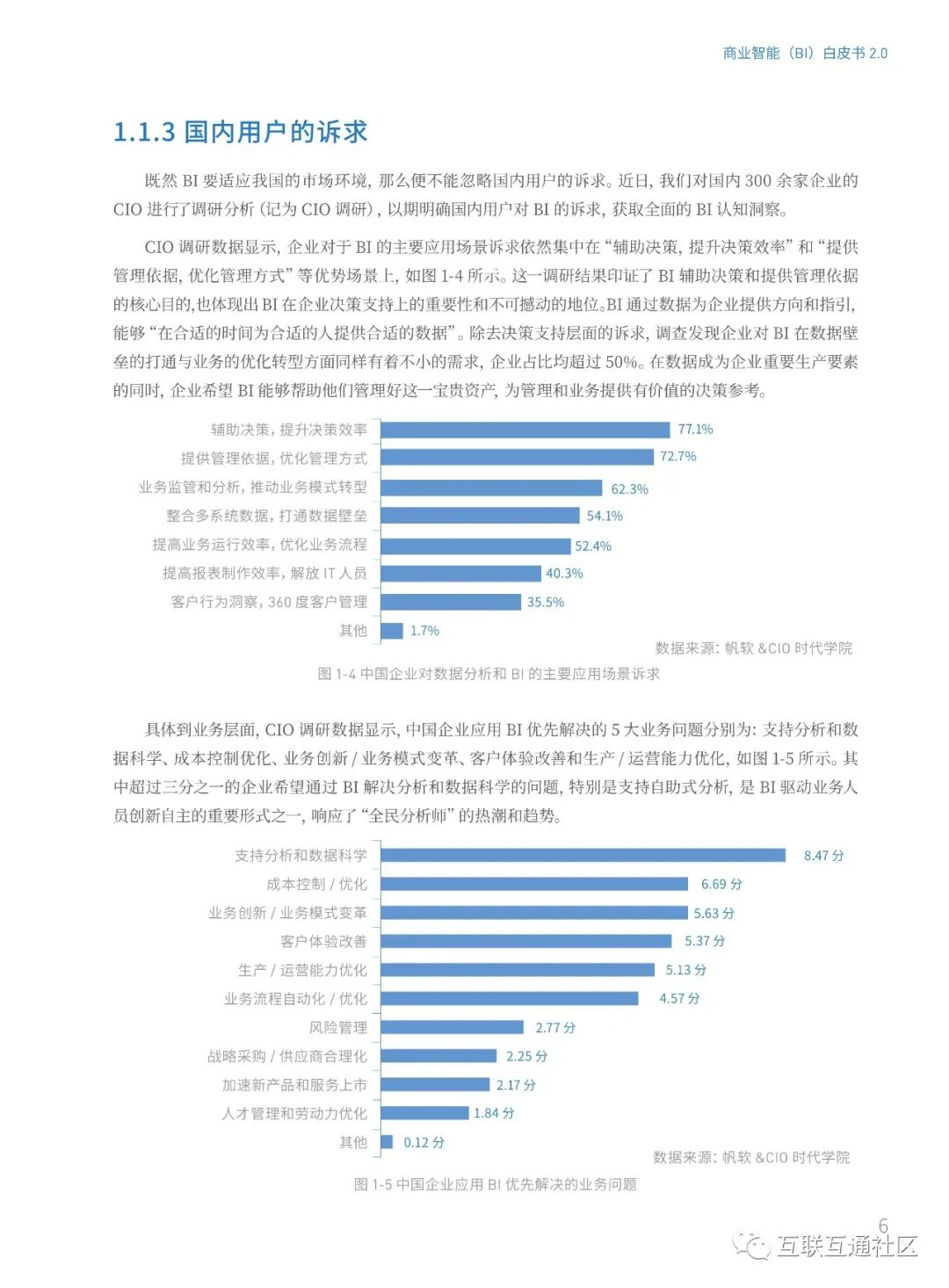 围绕这三个篇章,本白皮书 聚焦国内企业对 BI 的最新诉求和行业最前沿的发展趋势,基于我国的市场环境和企业需求调研,在梳理并 定义 BI 概念的同时,对整个 BI 行业市场、产品方向、功能技术等趋势进行了深入的分析洞察,并且基于大量 用户的 BI 落地实践,总结出了有效的 BI 应用经验。希望本白皮书的分析可以为我国企业的 BI 建设与数字化 转型提供参考和指导。