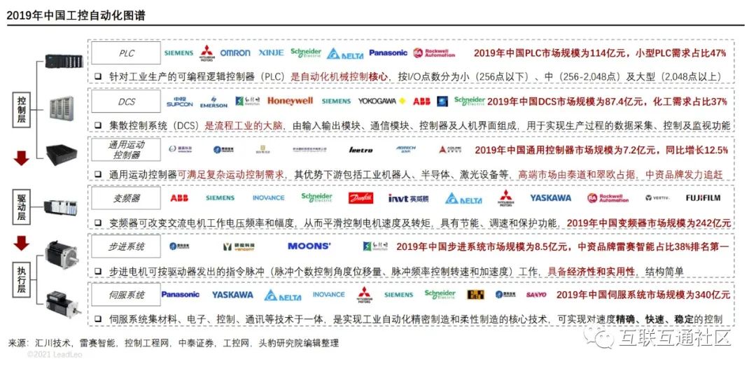 工控自动化包括控制层、驱动层和执行层三个层次,驱动层将控制层与执行层连接起来,控制层发出指 令后最终传导至执行层的步进与伺服系统