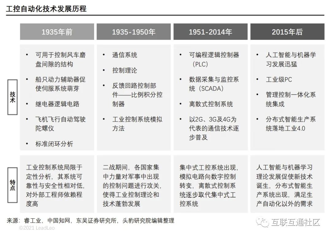 工控自动化自20世纪初萌芽,已有百年以上历 史。1935年前工控自动化起初应用于调整风车 磨盘间隙,随后作为伺服系统前身发动力辅助 器应用于船只。世界进入“电气时代”后,继电 器和闭环分析相继诞生。这一阶段的工控自动化偏向于定性分析,系统可靠性和安全性低, 对外部工程师依赖程度高。