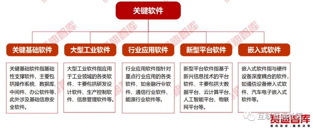 关键软件领域主要包括五大类软件:关键基础软件、大型工业软件、行业应用软件、新型平台软件、 嵌入式软件。