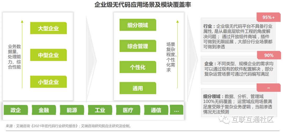 现阶段低代码产品已经可以覆盖95%+中小企业的场景,70%+中大型企业场景,以及50%垂直应用场景。从行业客户选型的角度来看,用户体验、成本控制以及是否能够给企业带来第二曲线、第三曲线的增长是考察的主要三大 因素,项目交付的速度及质量、是否会对组织能力运作方式造成冲击则是考察的次要因素。企业级无代码以柔性数据驱动 数据分析、管理及运营,不会改变用户的使用习惯;平滑无感的数据库切换、后台版本更新、测试运维,也最大程度保障 用户体验;企业级无代码的应用助力企业自身IT系统架构的创新升级,帮助企业打造数字化转型的核心竞争力。