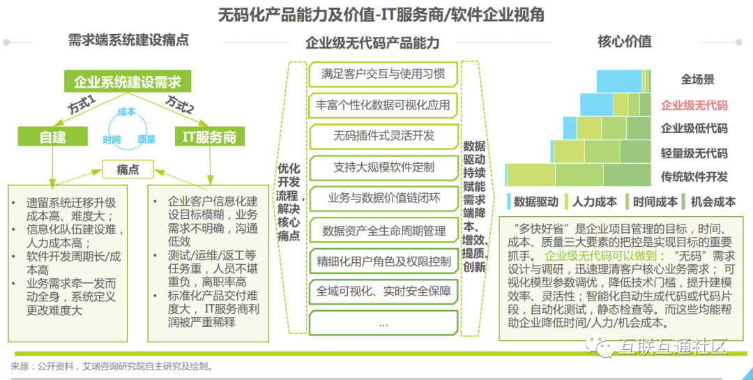 早期,中国信息化建设主要借鉴欧美国家成功经验,随着信息化建设迈入数智化发展阶段,创新变得愈发重要。低/无代码 解放沉重繁杂、冗余低质的开发工作,激活包括IT人员在内所有人的创新潜能;在成倍提升企业系统建设效率的同时,带 动需求端产品服务矩阵、商业模式创新,为企业发掘第二增长曲线。