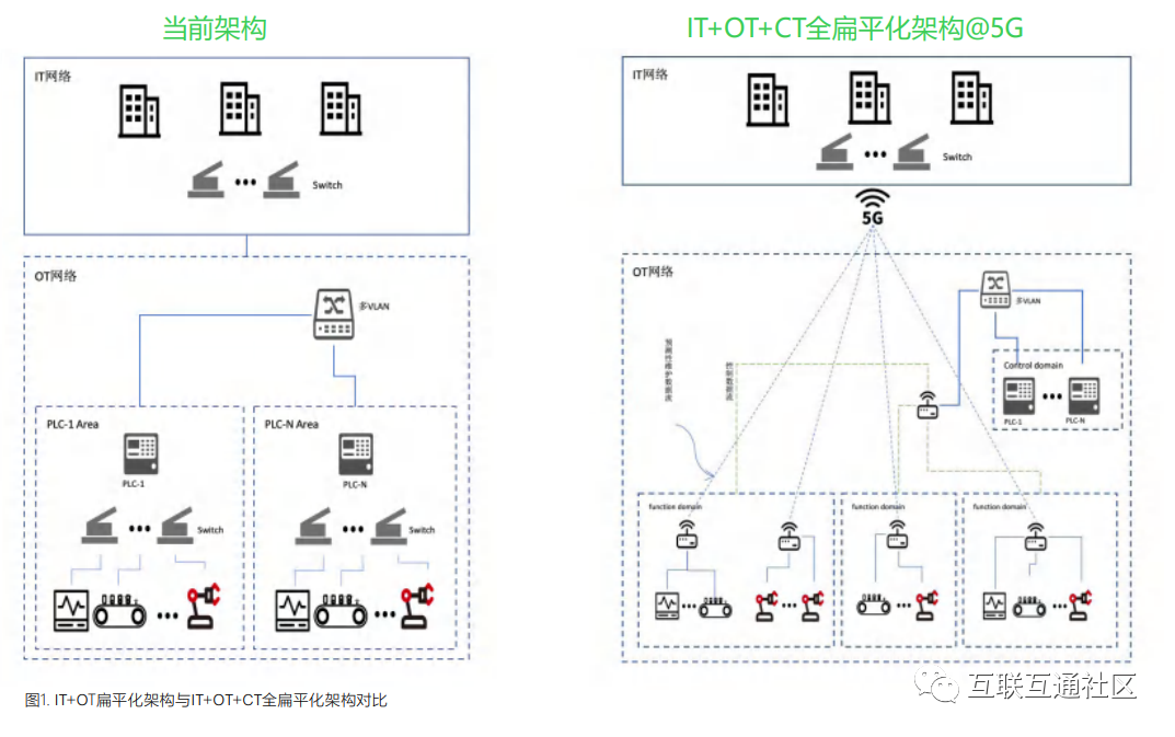 当前业界领先企业已逐步采用OT+IT扁平化的网络架构, 相较于传统的五层工控网络架构,扁平化网络架构的优势在于原有五层架构下的工业设备之间都可以通过网关 相互连接,实现网络联接与控制逻辑之间的解耦,同时 也实现了预测性维护数据流的从下至上的打通。基于有 线网络实现扁平化架构受限于组网配置与有线网关端口 的物理绑定,难以适应灵活快速的调整,且实现全域的 扁平化架构配置较为复杂。5G支持终端基于无线方式接 入,天然提供全域一张网的基础架构,摆脱了物理线路 和端口的绑定约束,可以灵活快速的进行组网配置等调 整。此外,相比于3G/4G,5G支持基于5G LAN特性的二层接入,可方便的进行OT和IT网络的扁平化融合,基于 5G的切片功能还可进一步实现单个设备中的多个业务承 载于不同VLAN的能力。基于这些功能,5G可以更便捷的 使能全域扁平化架构,使得工厂IT网络与OT网络间信息 能更灵活的流转,最大程度地满足高层级系统向现场层 延伸的需求,实时回传用于优化生产的数据。