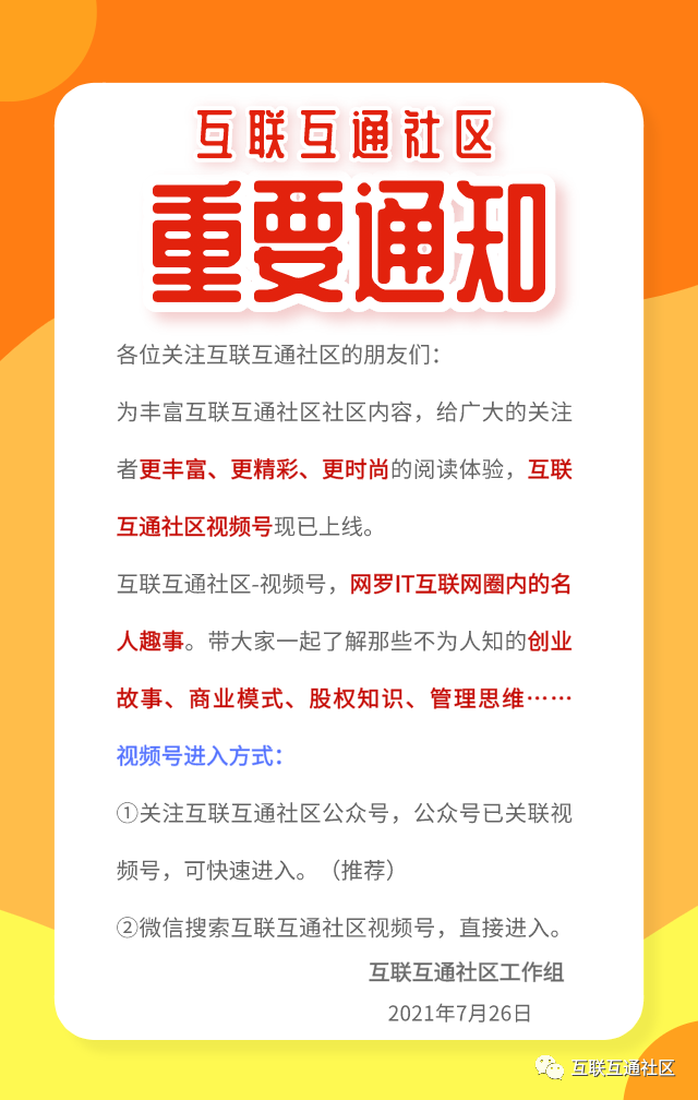 互联互通社区-视频号,网罗IT互联网圈内的名人趣事。带大家一起了解那些不为人知的创业故事、商业模式、股权知识、管理思维……