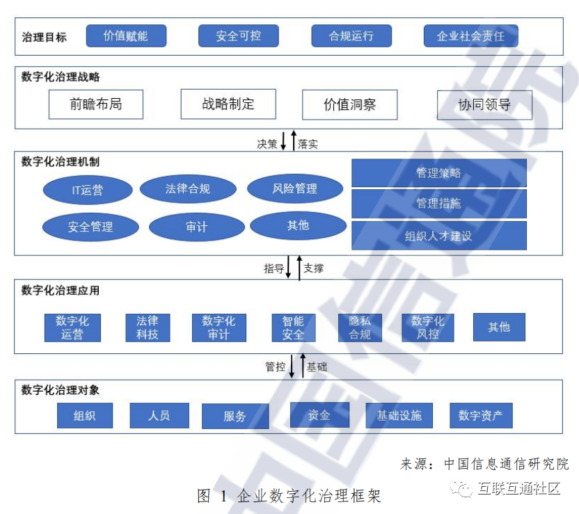 结合上述宏观和微观角度的数字化治理涵义,我们认为企业数字化治理的本质是企业治理活动的数字化和对数字化对象的治理。治理活动的数字化方面,数字化转型对企业传统治理体系进行了 数字化重塑,各领域治理流程和活动均经历显著数字化转变,如 IT 运营、安全管理、风险管理、审计、法律合规等领域。治理对象数字化方面,随着数据的生产要素属性增强以及人工智能、区块链、云计算等技术对生产力和生产关系的加速调整,全球对 于数据和新技术的治理愈发密集。对于企业来说,不仅仅要治理技术本身,还需要治理技术产生的外部性,数据及新兴技术等数字资产已成为企业稳定持续经营不可忽视的治理对象。
