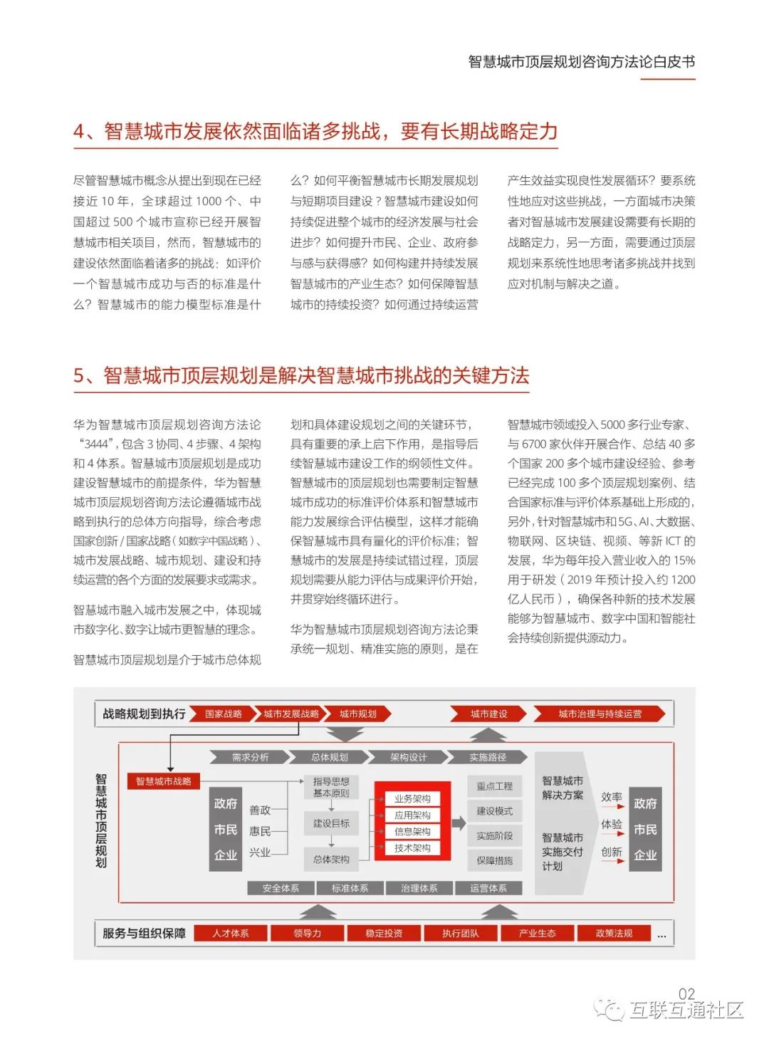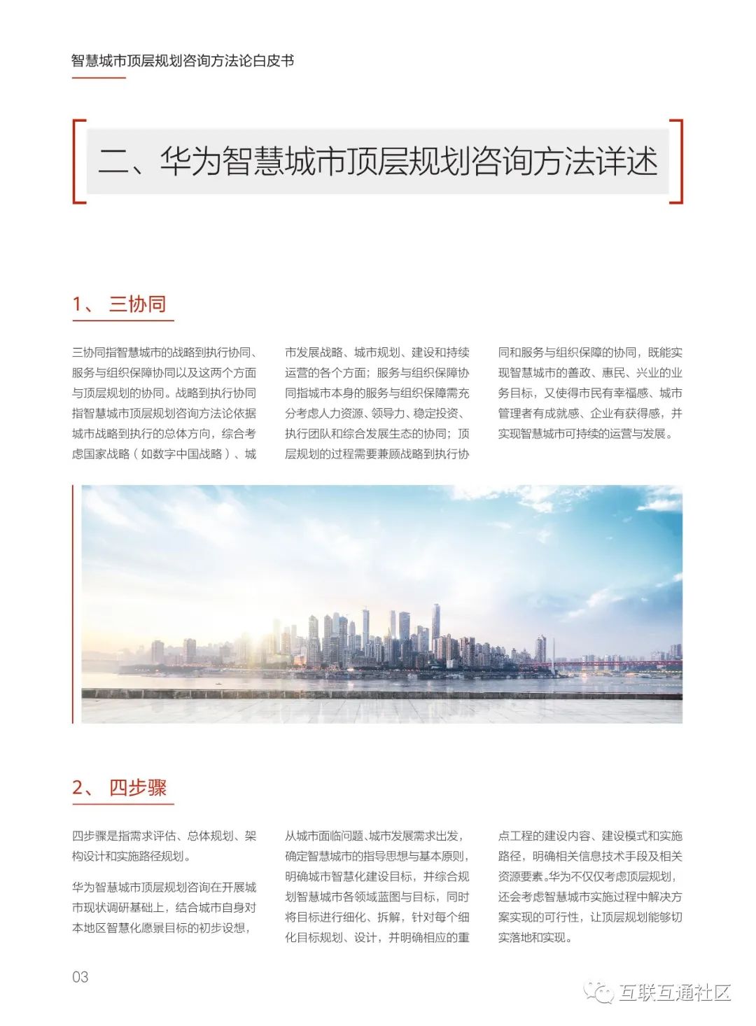 华为智慧城市顶层规划咨询方法论“3444”,包含 3 协同、4 步骤、4 架构和 4 体系。智慧城市顶层规划是成功建设智慧城市的前提条件,华为智慧城市顶层规划咨询方法论遵循城市战略到执行的总体方向指导,综合考虑国家创新/国家战略(如数字中国战略)、城市发展战略、城市规划、建设和持续运营的各个方面的发展要求或需求。智慧城市融入城市发展之中,体现城市数字化、数字让城市更智慧的理念。