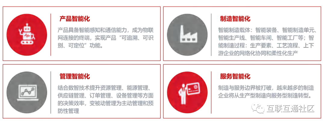 服务智能化:在产品智能化的基础上,企业与终端用户交互更为直接,为用户提供更好的服务体验将成为智能制造的重要组成和价值增量,越来越多的制造企业将从生产型制造向服务 型制造转型,制造与服务的边界逐渐消弭。