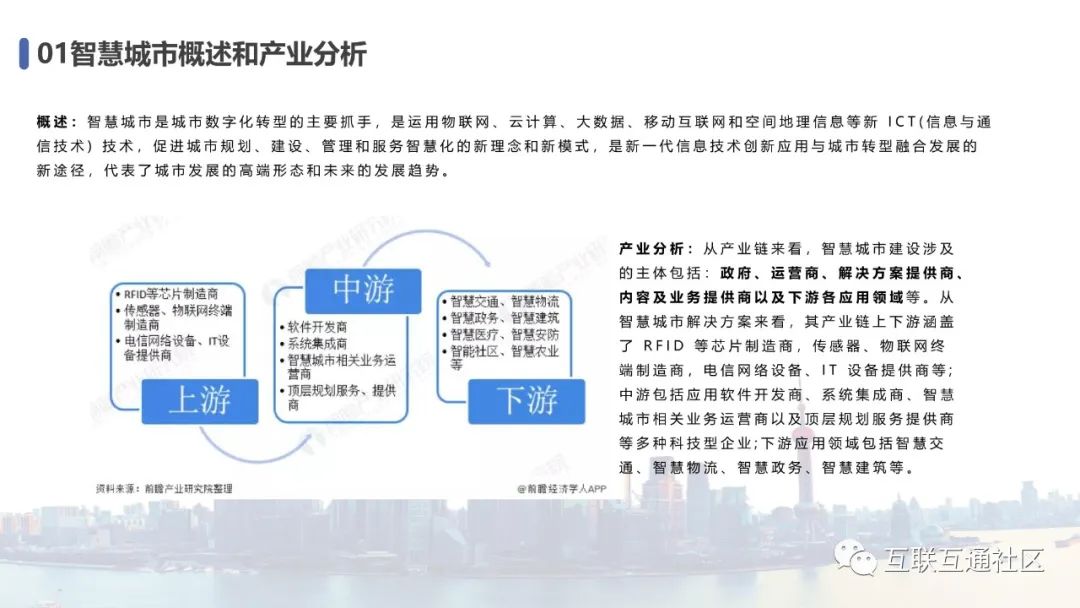 从产业链来看,智慧城市建设涉及的主体包括:政府、运营商、解决方案提供商 、 内容及业务提供商以及下游各应用领域等。从智慧城市解决方案来看, 其产业链上下游涵盖 了 R F I D 等芯片制造商,传感器、物联网终 端制造商,电信网络设备、 I T 设备提供商等 ; 中游包括应用软件开发商、系统集成商、智慧城市相关业务运营商以及顶层规划服务提供商等多种科技型企业 ; 下游应用领域 包括智慧交通、智慧物流、智慧政务、智慧建筑等。