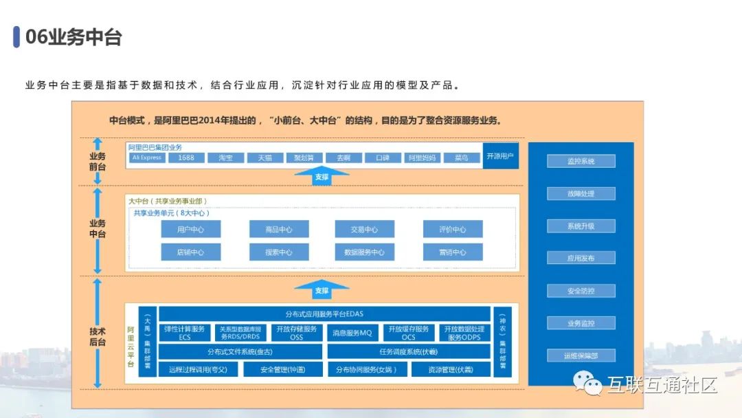 阿里巴巴认为:中台不仅是个组织,中台是个理念。中台自己单独的产品不能直接产生价值、不能直接对外服务,一定要变成别人产品的一部分,让别人的产品提供更好的服务。