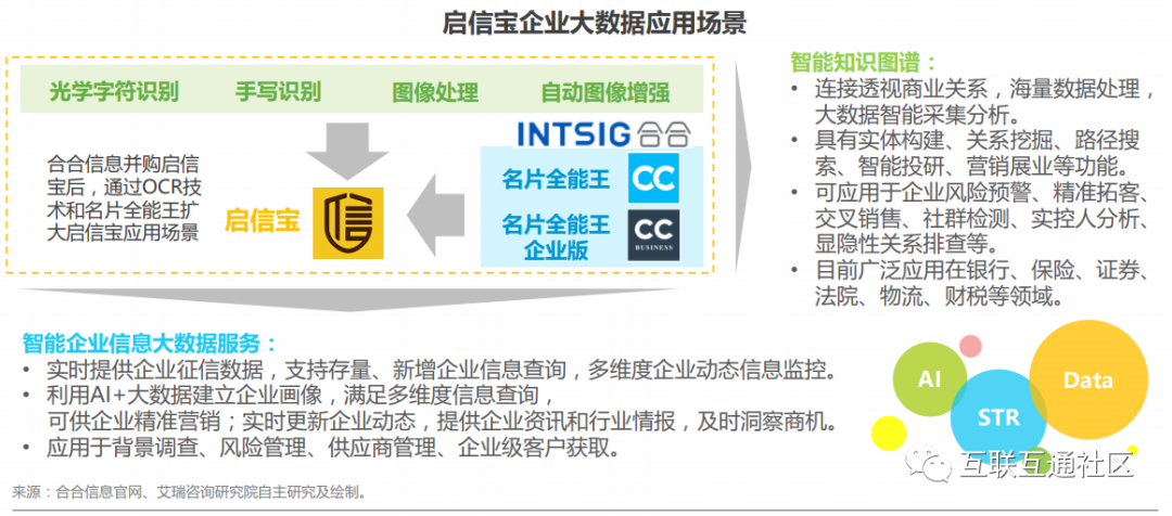 启信宝2015年9月被合合信息收购,纳入名片全能王旗下,将商业查询结合AI及大数据,赋能企业合规风控。合合信息致力 于OCR识别技术和企业大数据应用,在光学字符识别、手写识别、图像处理及自动图像增强等领域拥有先进技术,旗下拥有 名片全能王、扫描全能王、启信宝等多款App,并用“STR(场景文字识别)+AI+DATA”赋能企业全商业场景。启信宝通过挖 掘公开数据等方式,利用AI技术帮助企业梳理和核对供应商或客户信息,对供应商的资质、商业信誉等提供真实信息,帮助 企业对供应商或客户进行多维度考量。除此之外,启信宝和全能名片王进行数据信息、名片信息等合作,共同为客户赋能。