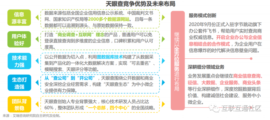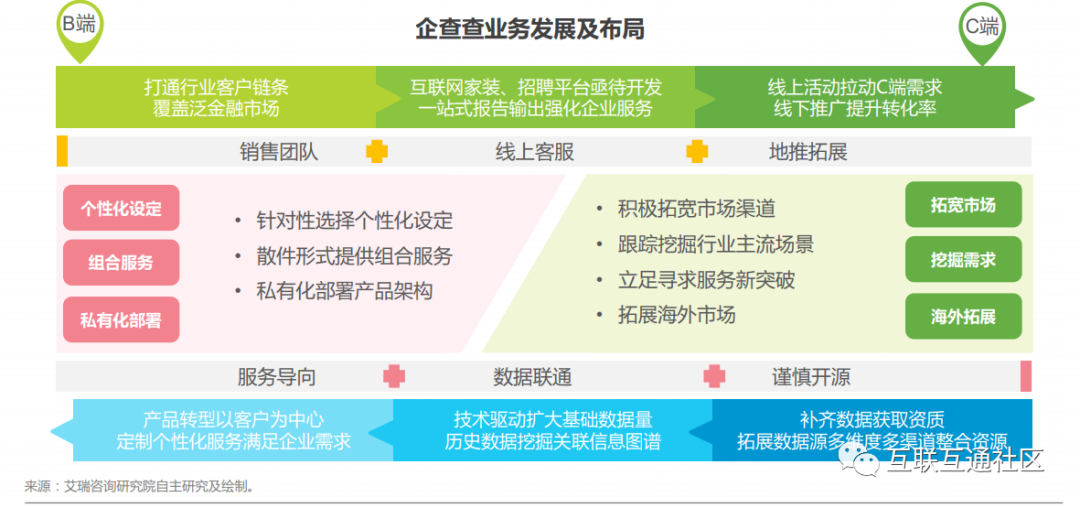 截至2019年12月,企查查已累计为3000余家付费客户提供商业服务,除了基础商业查询平台外,还向客户输出企业信用 报告、投资任职及风险报告、股权穿透报告等多种报告类型。此外,企查查于2019年10月获得万得投资和兴富资本的数 亿元融资,未来仍将加快数据源的获取和更新,并结合其线上与线下销售团队维护大客户关系。2020年,企查查先后成立 了海南子公司和新加坡子公司,并发布针对全球企业与用户的海外征信报告,助力我国企业安全出海。企查查产品以客户 为中心并不断转型,拓展服务范围满足企业定制化需求。