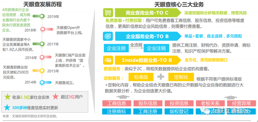 天眼查自2014年成立以来,持续拓展业务蓝图,并在2019年4月成为企业征信备案重新开放后首个获得央行企业征信备案 资质牌照的企业,也是行业内首家获央行颁发该资质的商业查询平台厂商。天眼查系列产品收录了2.3亿家社会实体、300 多种维度信息全量实时更新,不仅可以可视化呈现复杂的商业关系,还可以深度挖掘和分析相关数据,实现了风险从预警 到洞察的全方位把控。目前,天眼查已有超过3亿用户,处于行业领先地位。此外,天眼查基础商业查询业务、进阶的企 业服务业务和Inside数据业务不断提升企业盈利水平,助力社会主义诚信体系建设,天眼查普及中国特色惠普型商业查询。