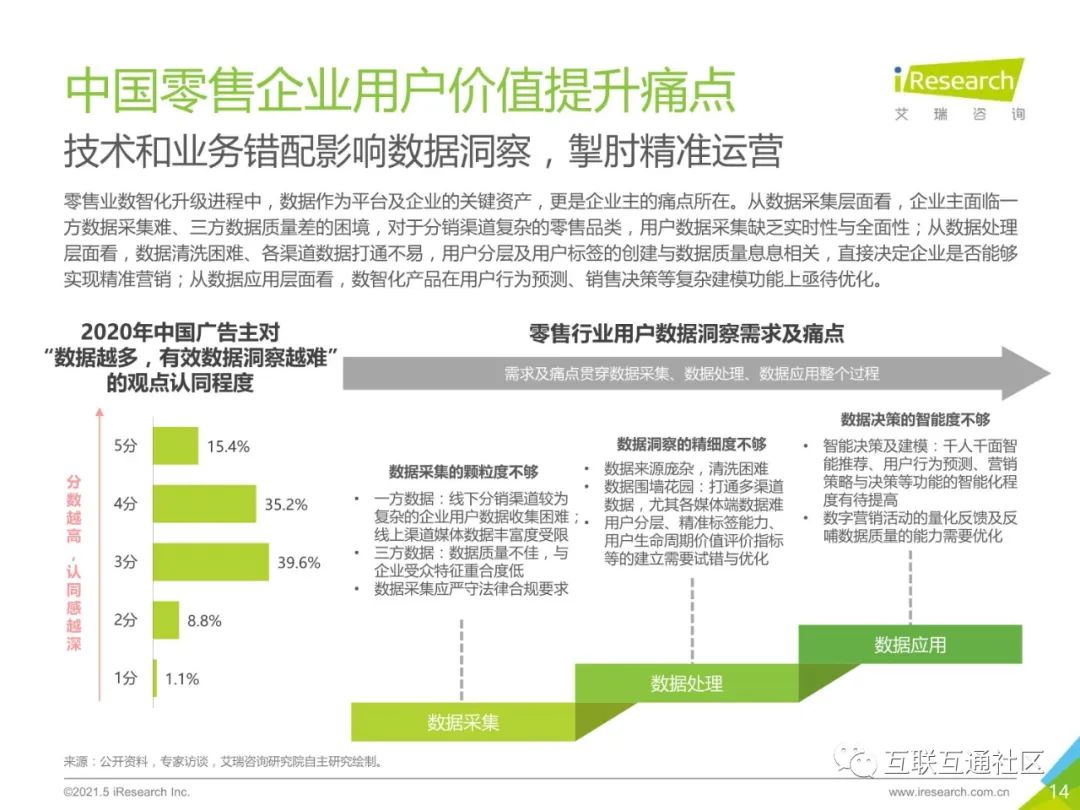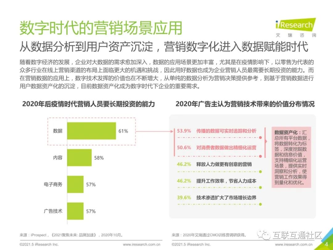 随着数字经济的发展,企业对大数据的需求愈加深入,数据的应用场景更加丰富,尤其是在疫情影响下,以零售为代表的 众多行业在线上营销渠道的布局上面临更大的机遇和挑战,因此用好数据也成为企业营销人员最需要长期投资的能力。而 在营销数据的应用上,数字技术发挥的价值也在不断增大,从单纯的数据分析为营销决策提供参考,到基于营销数据进行 用户数据资产化的沉淀,目前数据资产化成为数字时代下企业的重要需求。