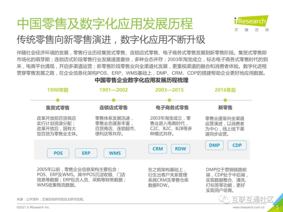 伴随社会经济环境的发展,零售行业历经集贸式零售、连锁店式零售、电子商务式零售发展到新零售阶段。集贸式零售即 市场化的萌芽期;连锁店式阶段零售行业发展速度最快,多种业态并存;2003年淘宝成立,标志电子商务式零售时代的到 来,电商平台涌现,开启多渠道运营;新零售阶段零售业向全渠道化发展,更重视渠道的融合和消费者体验。数字化进程 贯穿零售发展之路,在企业信息化架构POS、ERP、WMS基础上,DMP、CRM、CDP的搭建帮助企业更好地应用数据。