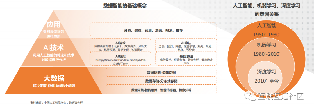 数据智能(Data Intelligence)是什么呢?数据智能是指基于大数据,通过人工智能(AI)对海量数据进行处理、分析和挖掘, 提取数据中所包含的有价值的信息和知识,使数据具有“智能”,并通过建立模型寻求现有问题的解决方案以及实现预测等。AI 主要由AI技术、算法、框架和基础算法四部分构成,在其发展历程中,先后以机器学习和深度学习作为其主流算法。