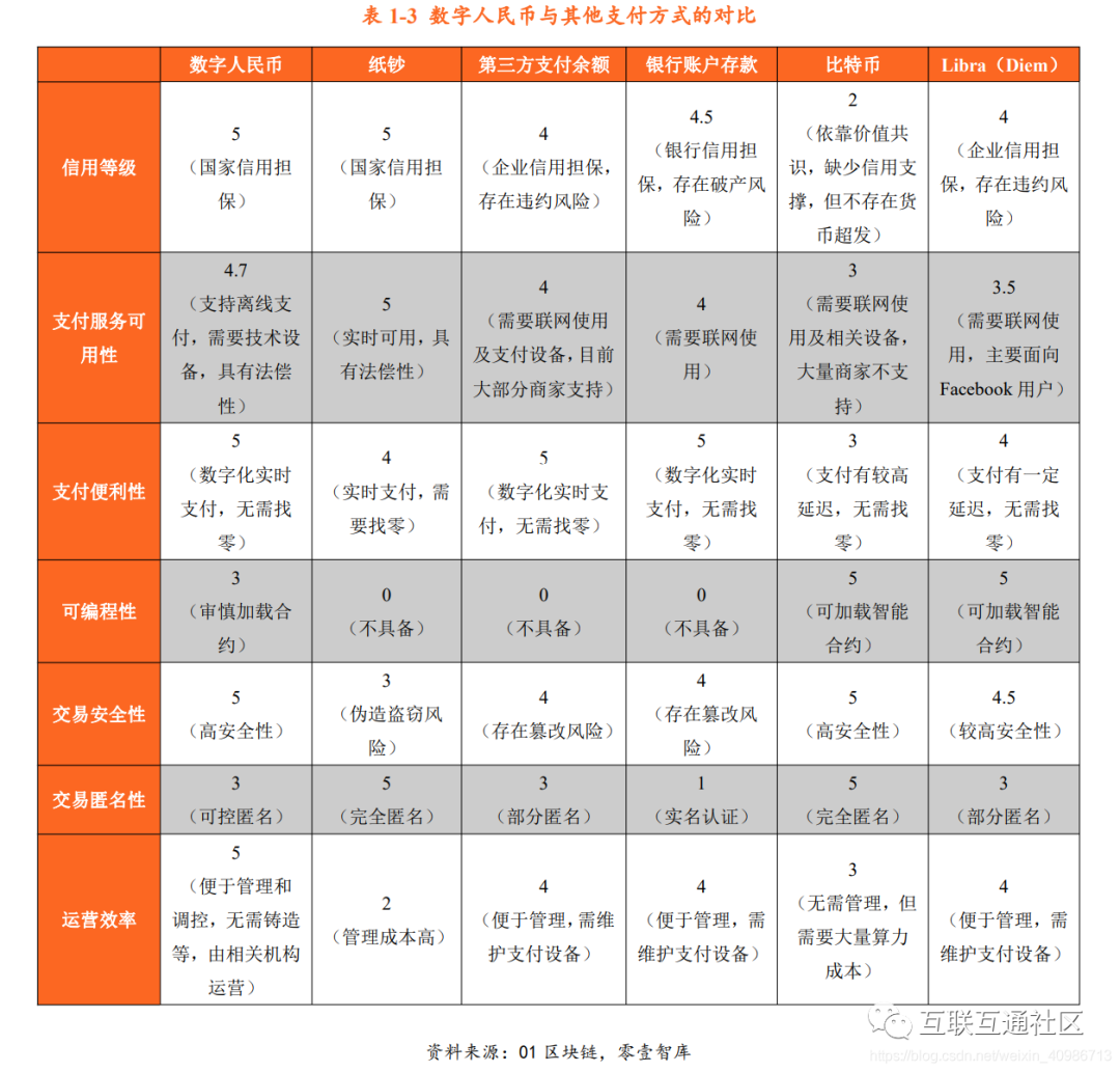 参考美联储和中国人民大学金融科技研究所的研究,可以进一步从运营效率、支付 便利性、匿名性等 7 个维度对各支付方式进行量化评估,如下表 1-3 所示(各项满分为 5 分)。