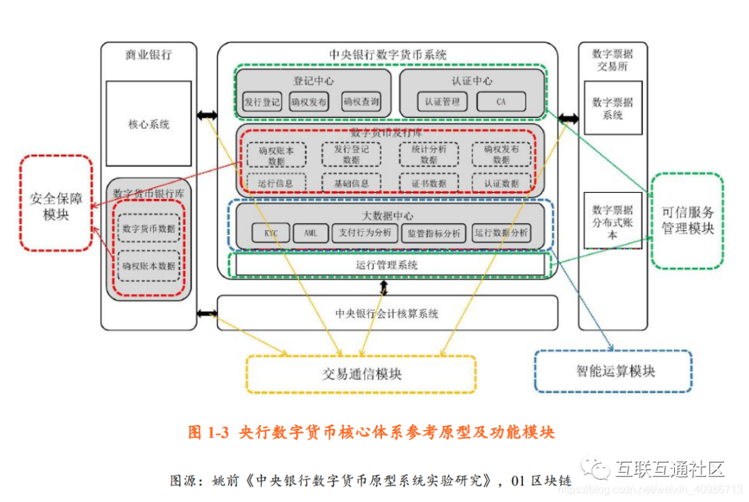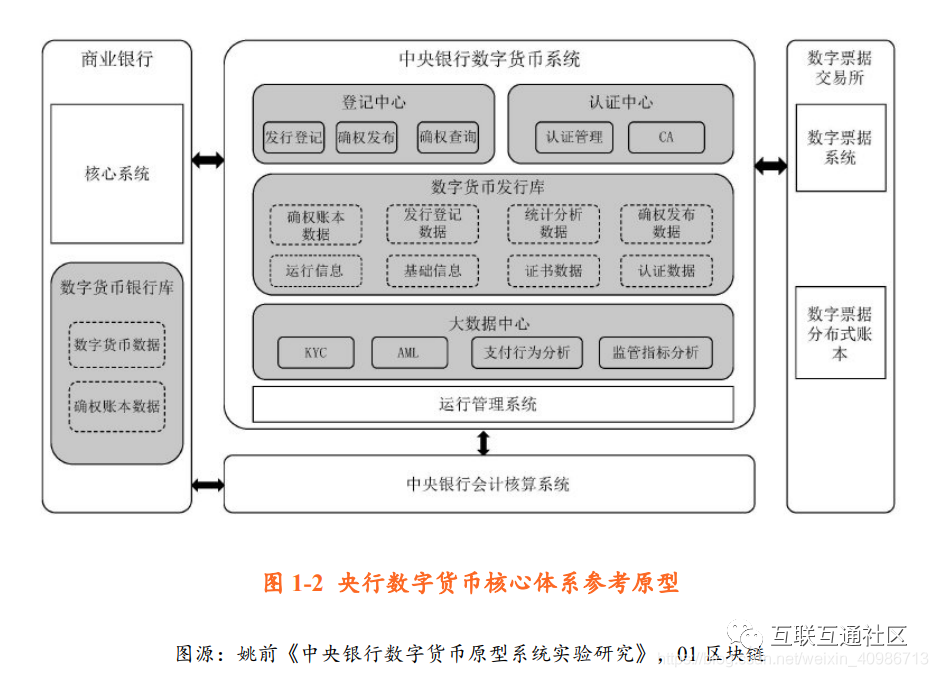 如图 1-2 是一种参考原型,展示了中央银行和商业银行针对央行数字货币的大致架构,数字人民币的投放、回笼、追溯等环节都要围绕“一币两库三中心”的核心体系进行