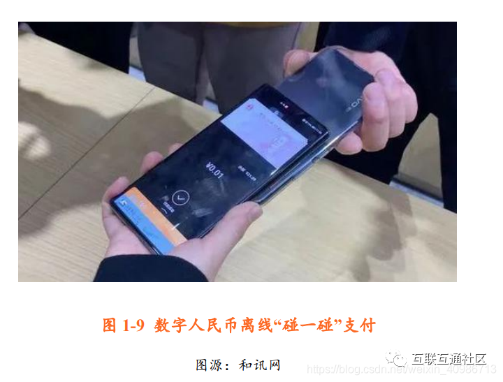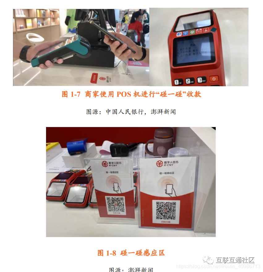 “碰一碰”则是利用 NFC 技术的近程支付方式,可以在线进行也可以离线进行,但 要求手机必须安装数字人民币硬件钱包。(2020 年 10 月 30 日,据华为终端官方微博消 息,华为 Mate40 系列是首款支持数字人民币硬件钱包的智能手机。)在线情况下,可 以利用 POS 机或专用芯片进行支付,如图 1-7,用户打开数字人民币 APP,点击设置界 面打开 NFC,用手机与商户 POS 机感应区轻轻“碰一碰”,就可实现支付;图 1-8 展示了 芯片感应区的支付场景。