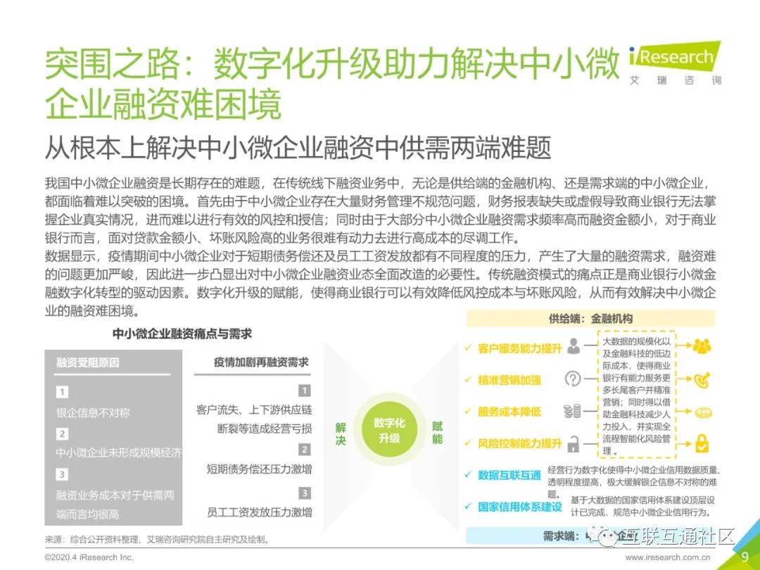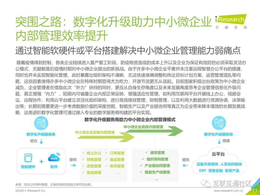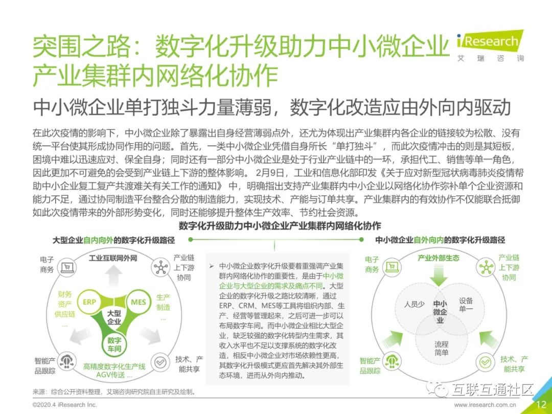 全产业链数字化升级是当下“突围之路”:数字化升级助力解决中小微企业融资难困境,从根本上解决中小微企业融资中供需两端难题。数字化升级助力中小微企业商业模式转变,不同类别中小微企业需采取不同策略开展线上经营。数字化升级助力中小微企业内部管理效率提升,通过智能软硬件或平台搭建解决中小微企业管理能力弱痛点。数字化升级助力中小微企业产业集群内网络化协作,中小微企业单打独斗力量薄弱,数字化改造应由外向内驱动。