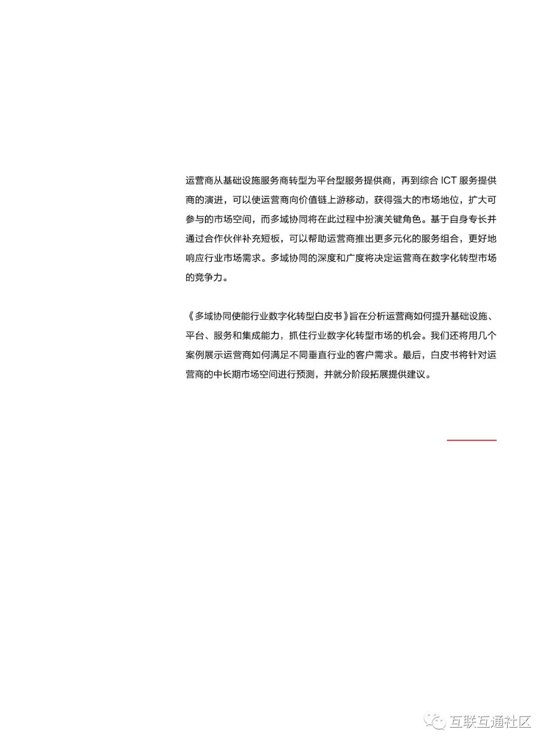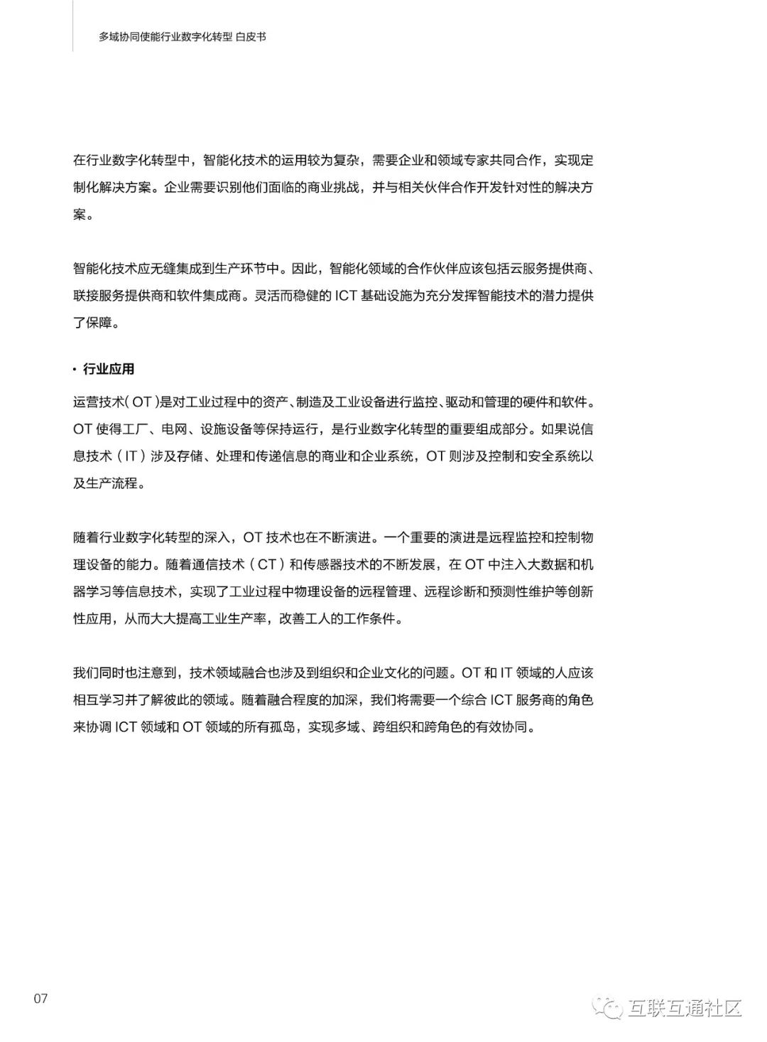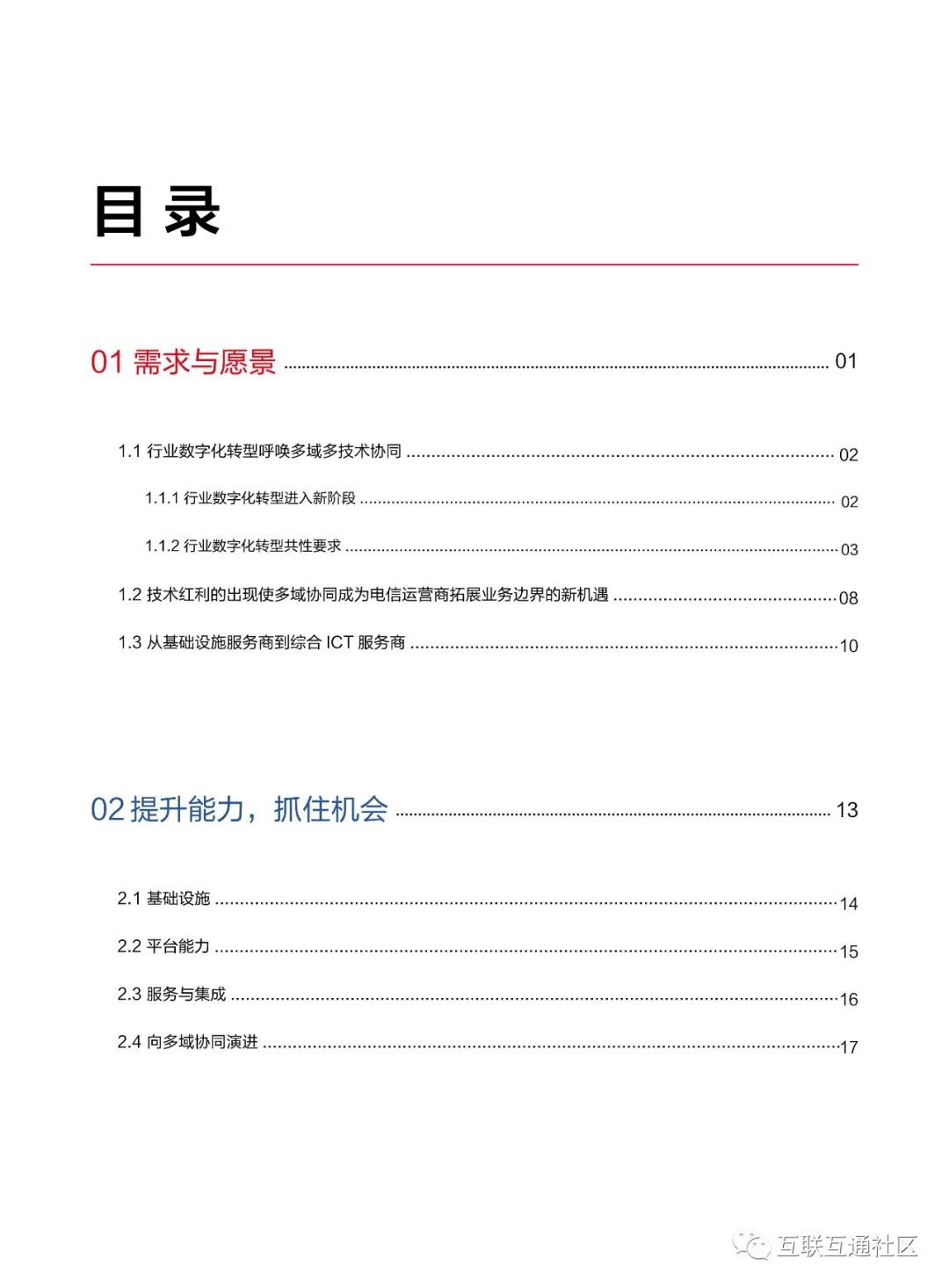 要实现数字化转型,必须借助综合全面的 ICT 服务。这对电信运营商而言是 极好的机遇,通过建立多域协同的能力,扩展业务边界。多域协同指的是联接、 计算、云、智能等 ICT 技术与运营技术(OT)结合,构建端到端的数字化 转型价值链。