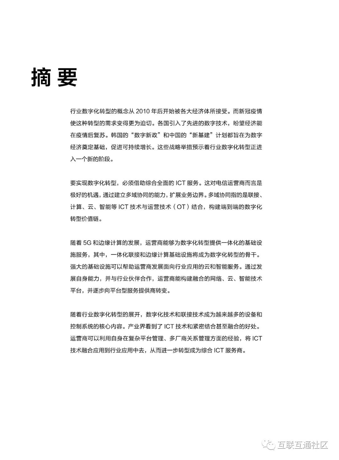 随着行业数字化转型的展开,数字化技术和联接技术成为越来越多的设备和 控制系统的核心内容。产业界看到了 ICT 技术和紧密结合甚至融合的好处。运营商可以利用自身在复杂平台管理、多厂商关系管理方面的经验,将 ICT 技术融合应用到行业应用中去,从而进一步转型成为综合 ICT 服务商。