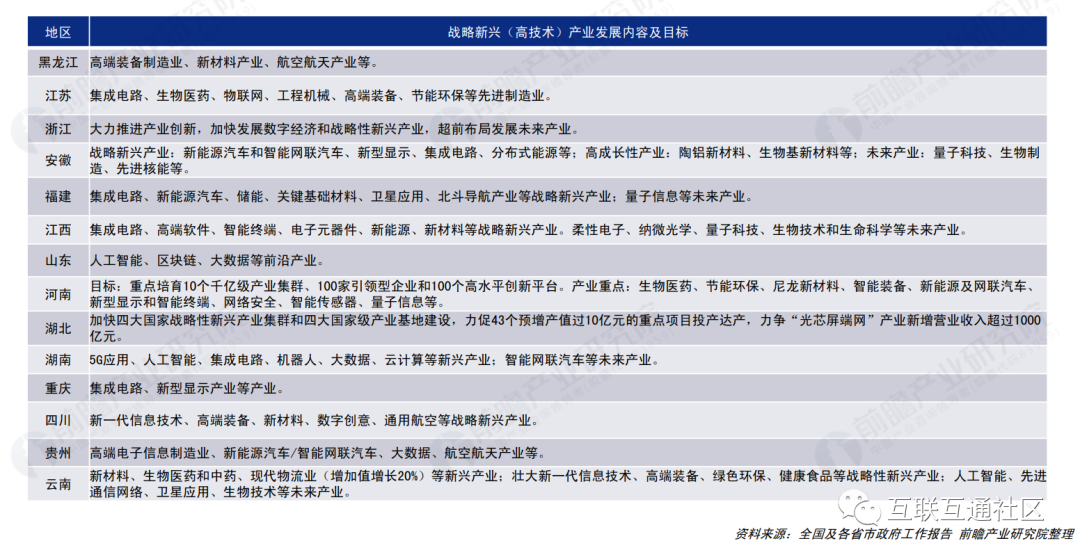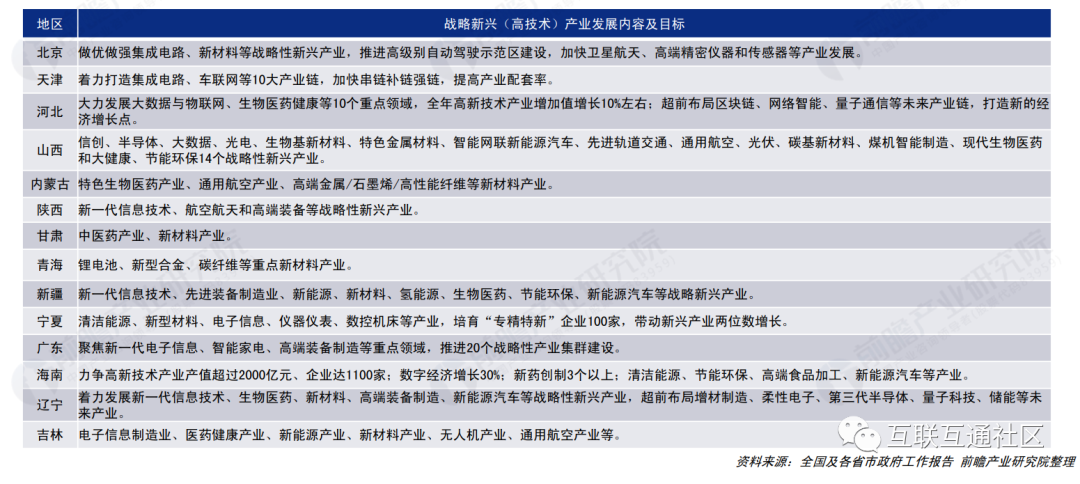 此外,围绕产业结构调整和升级基础,以战略新兴产业、高技术产业和未来产业等为重点,培育壮大发展新动能,打造新的经济增长点,从而推动地区经济持续、高质量发展,成为各省市发展重点。2021年各省市政府工作报告中,战略新兴(高技术)产业发展内容及目标如下: