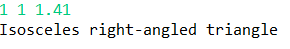 else if((a==b||b==c||c==a)&&(((a*a+b*b)-c*c<1)||((c*c+b*b)-a*a)<1||((c*c+a*a)-b*b<1))) { System.out.println("Isosceles right-angled triangle"); }