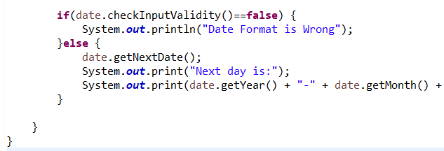public static void nextDate(int year,int month,int day) { switch(month) { case 1: case 3: case 5: case 7: case 8: case 10: if(day == 31) { day = 1; month ++; }else day ++;break; case 12: if(day == 31) { day = 1; month = 1; year ++; }else day ++;break; case 4: case 6: case 9: case 11: if(day == 30) { day = 1; month ++; }else day ++;break; case 2: if(isLeapYear(year) == true && day == 29) { day = 1; month ++; }else if(day == 28) { day = 1; month ++; }else day ++;break; } System.out.print("Next date is:" + year + "-" + month + "-" + day); }