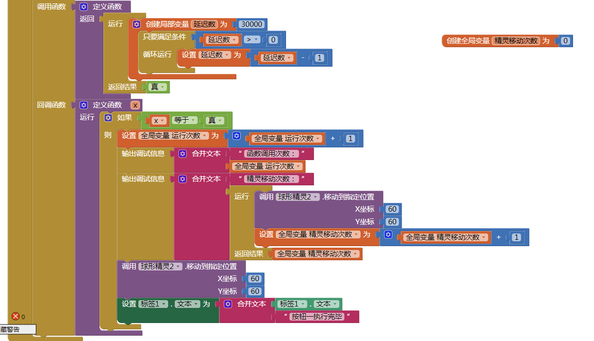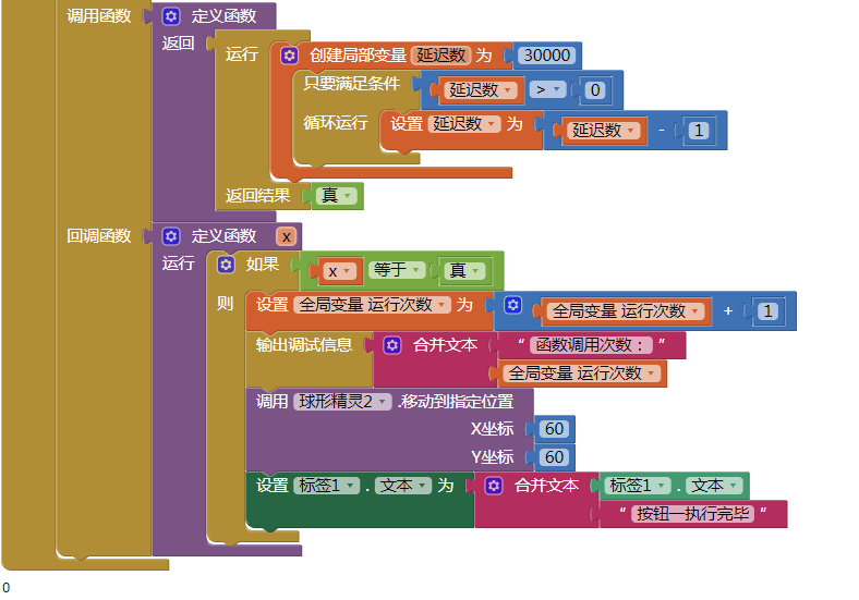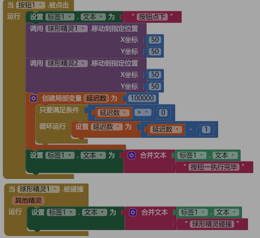在wxbit汉化版中,这里用一个循环模拟延时操作,如果是一个事件里的耗时操作如下图,实测在耗时操作完成后才会先运行按钮其他点击事件(并且先运行耗时循环操作,再按代码顺序运行操作,并不是这个耗时操作会按代码顺序会在中间运行。原因:循环运行会新开线程),再运行精灵碰撞事件。最终的标签会标签文本显示 “按钮一执行完毕球形精灵碰撞。、”