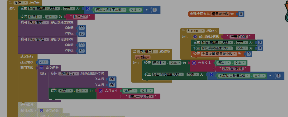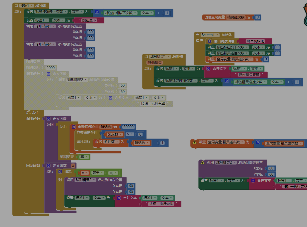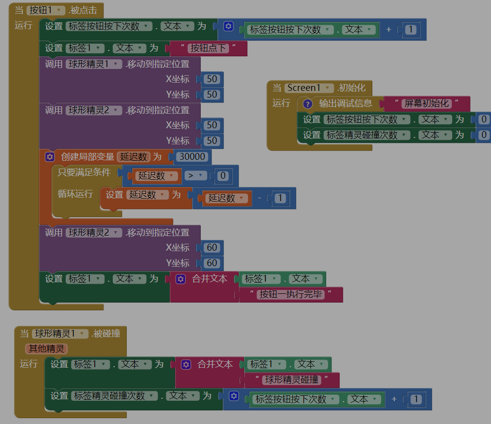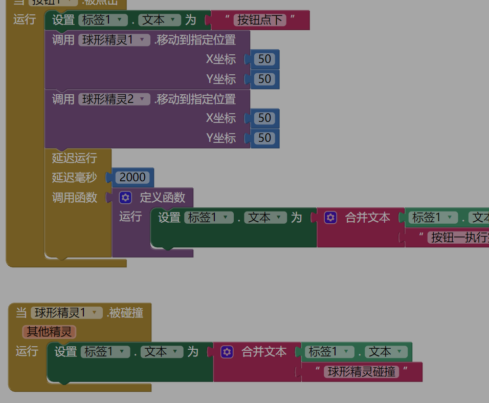 这时候如果快速点击按钮1,执行完毕这四个字会照按钮点了多少次出现,但是精灵碰撞次数就对不上按钮点击次数了。此时按钮的点击事件作为高优先级事件先运行,打断了 调用球形精灵移动, 精灵移动被放入事件队列在按钮点击运行完成后才运行,证明在主UI线程组件的事件优先级高。
