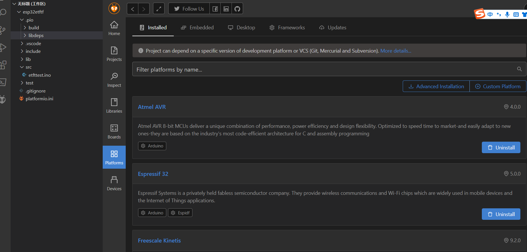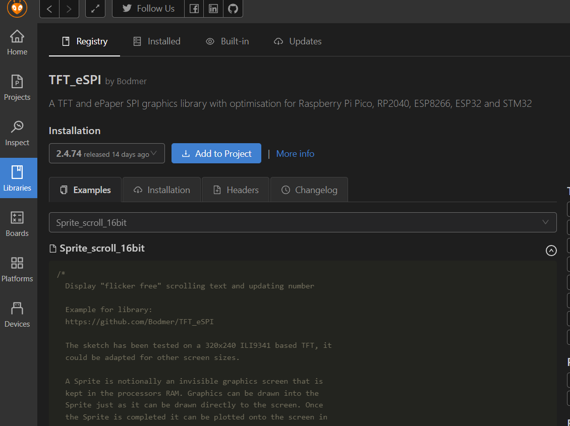 新建工程 平台选 esp32 开发板选 esp32dev 架构选arduino 然后搜 tft-espi 添加到这个工程里
