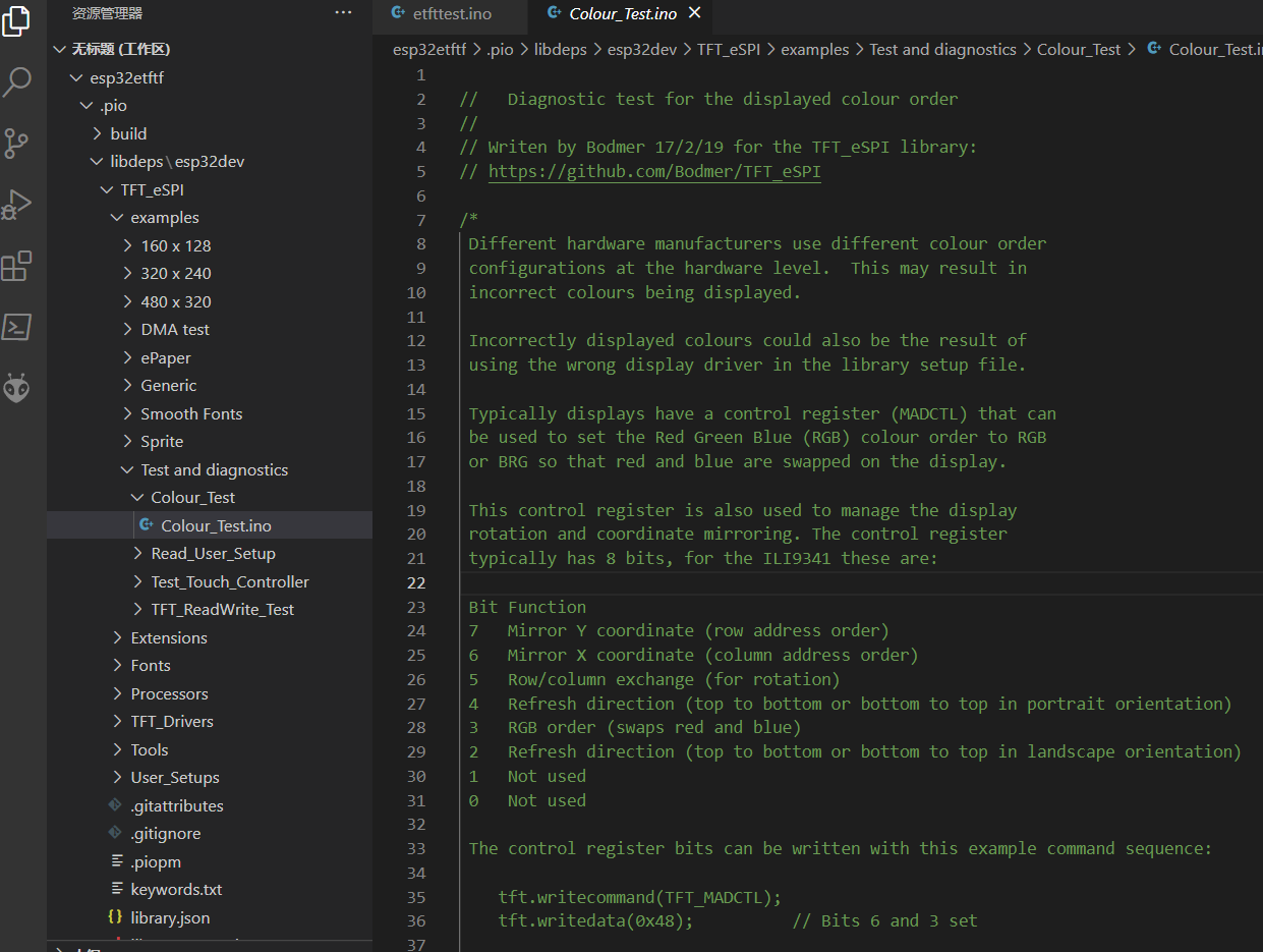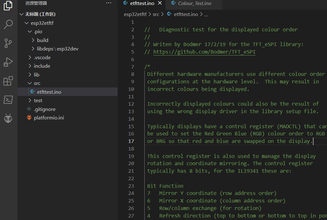 把tft espi的例子文件夹里的内容拷贝到src文件夹里的cpp文本里