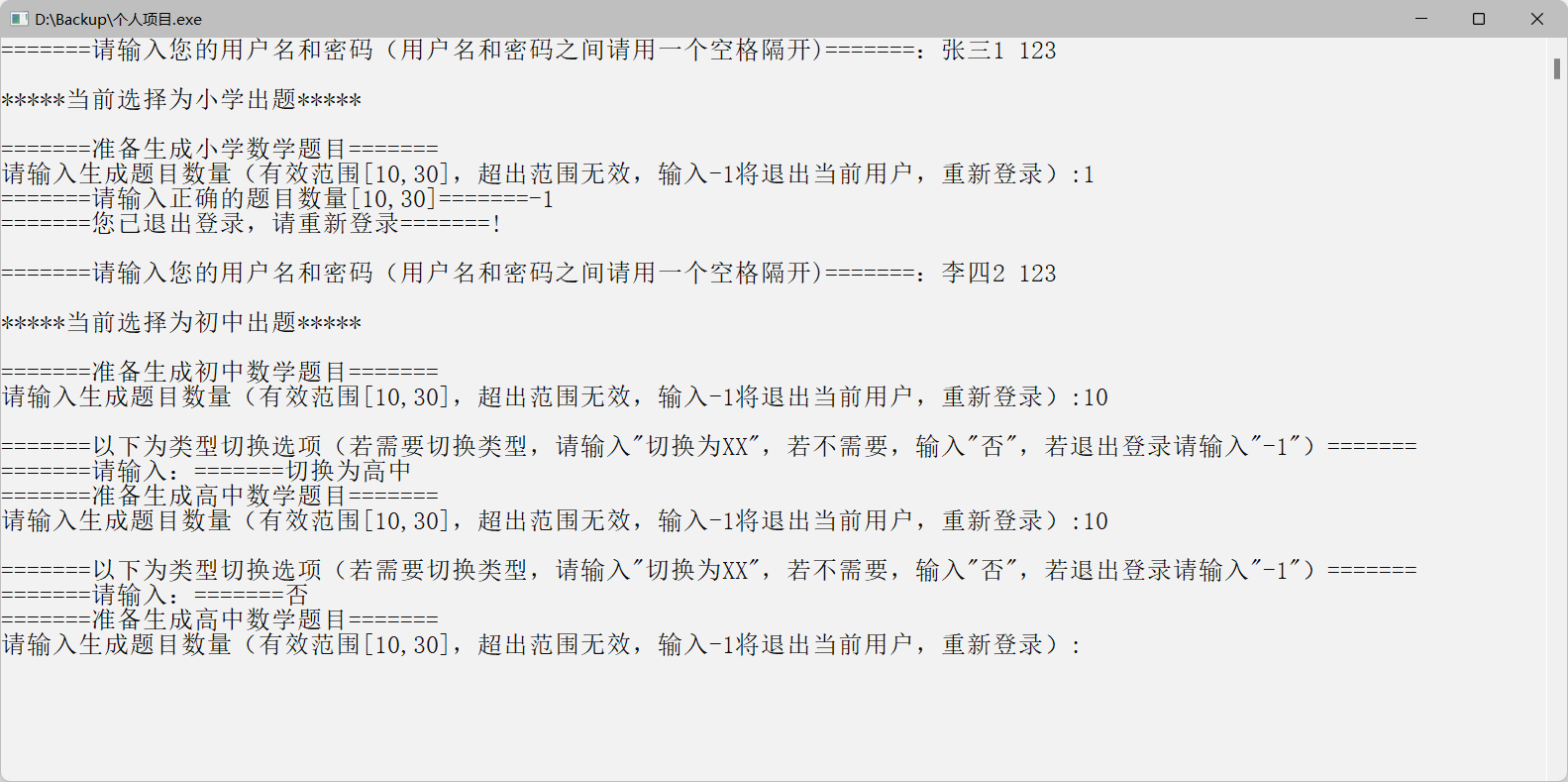 cout<<"请输入生成题目数量(有效范围[10,30],超出范围无效,输入-1将退出当前用户,重新登录):";