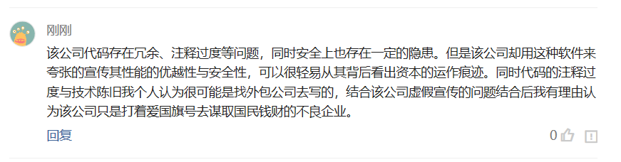 该公司代码存在冗余、注释过度等问题,同时安全上也存在一定的隐患。但是该公司却用这种软件来夸张的宣传其性能的优越性与安全性,可以很轻易从其背后看出资本的运作痕迹。同时代码的注释过度与技术陈旧我个人认为很可能是找外包公司去写的,结合该公司虚假宣传的问题结合后我有理由认为该公司只是打着爱国旗号去谋取国民钱财的不良企业。