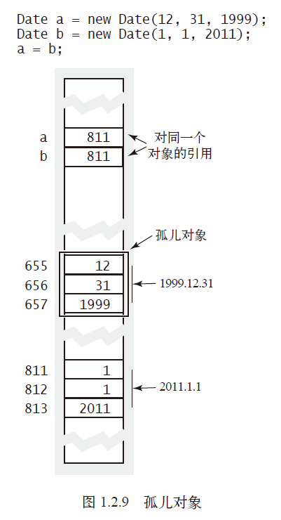 图中所示的三行赋值语句。在第三行赋值语句之后,不仅a 和b 会指向同一个Date 对象(1/1/2011),而且不存在能够引用初始化变量a 的那个Date 对象的引用了。