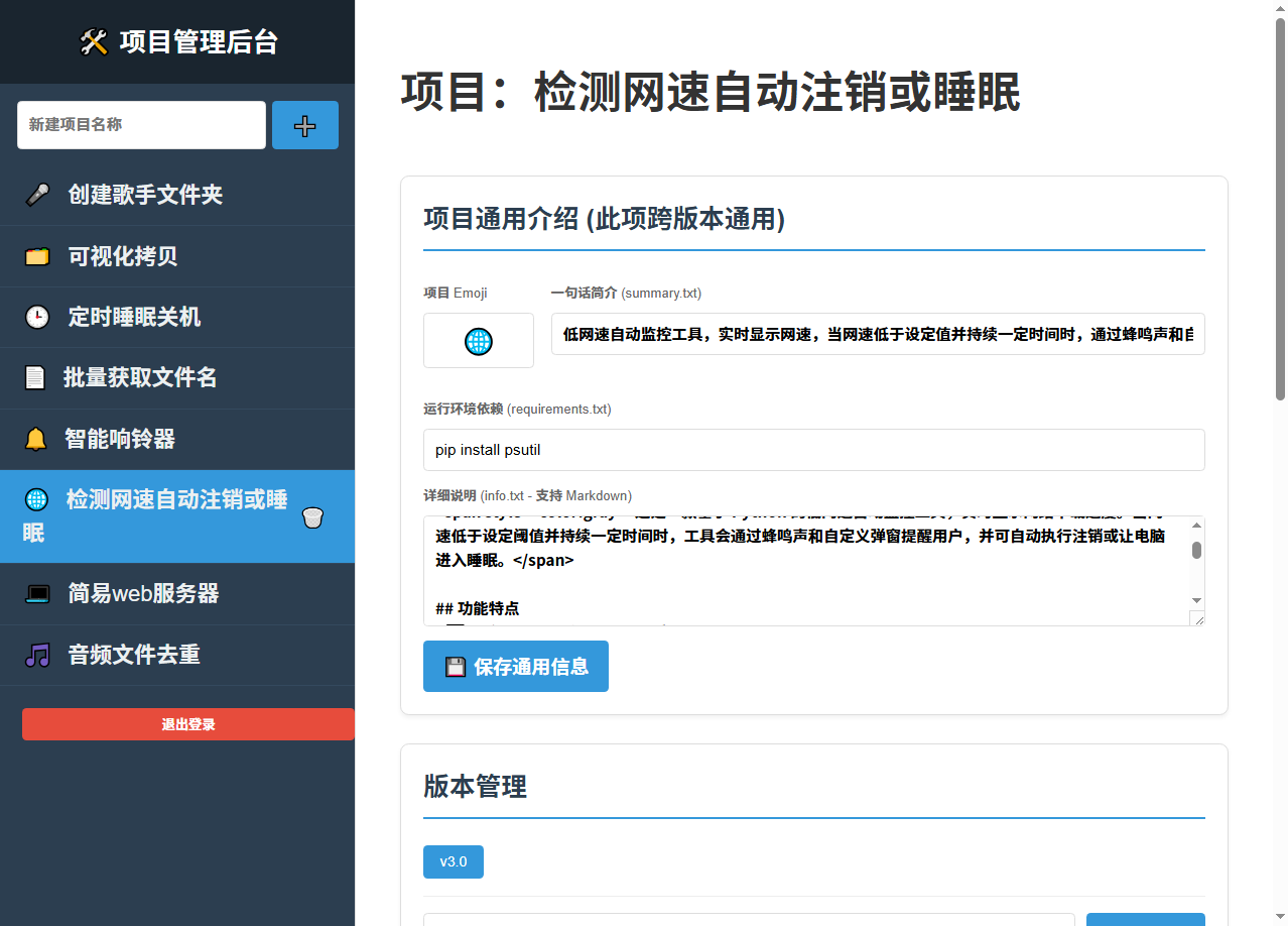 一个用于存放 Python 代码的平台,具有前后端页面。可设置和展示多个项目(pyhton制作的小工具),每个项目都可以设置、上传:代码、界面截图、exe程序,还可以设置一句话简介和详细介绍(支持Makedown)。