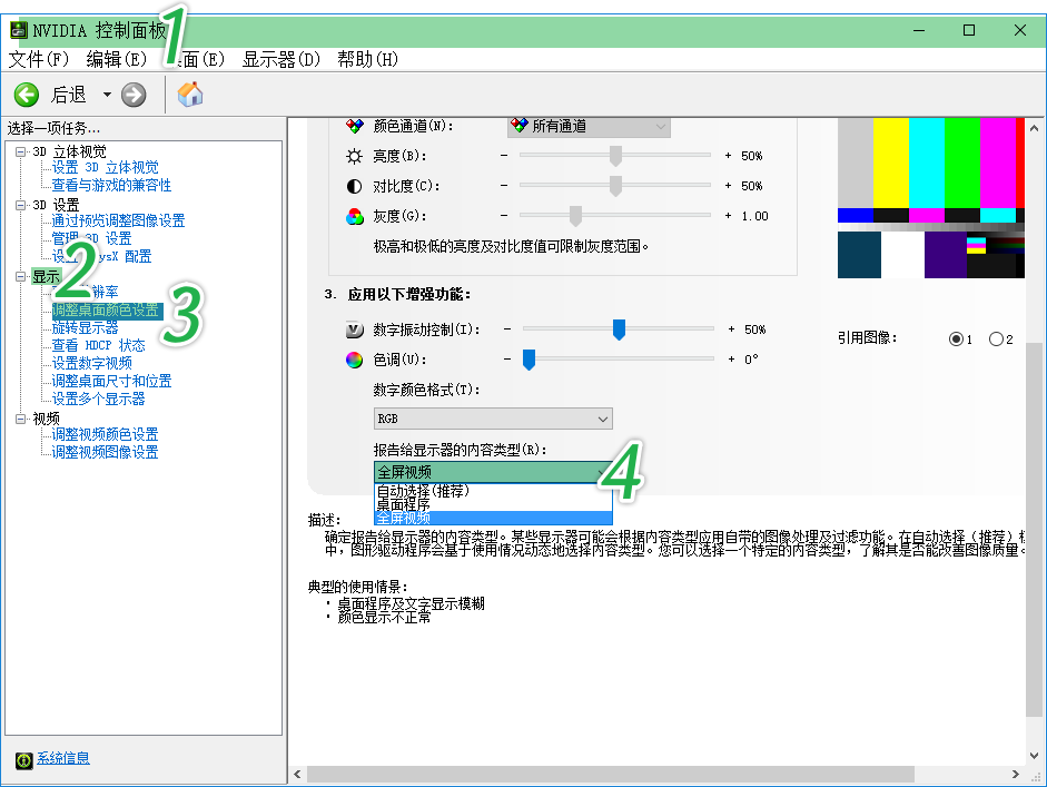 2、参考下图,将「报告给显示器的内容类型」改为「全屏视频」即可。