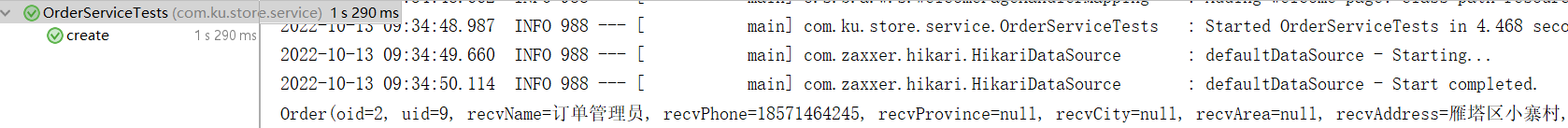 @Test public void create(){ try{ Integer aid = 1; Integer[] cids = {2, 3}; Integer uid = 9; String username = "订单管理员"; Order order = orderService.create(aid, cids, uid, username); System.out.println(order); }catch(ServiceException e){ System.out.println(e.getClass().getSimpleName()); System.out.println(e.getMessage()); } }