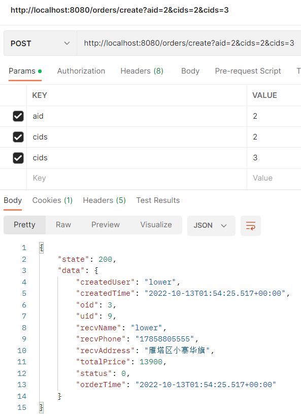 @RestController @RequestMapping("/orders") public class OrderController extends BaseController{ @Autowired private IOrderService orderService; @PostMapping("/create") public JsonResult<Order> create(Integer aid, Integer[] cids, HttpSession session){ Integer uid = getUidFromSession(session); String username = getUsernameFromSession(session); Order data = orderService.create(aid, cids, uid, username); return new JsonResult<Order>(OK, data); } }