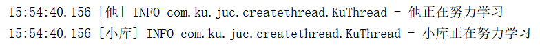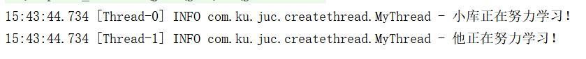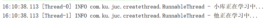 Runnable mt1 = new RunnableThread("小库"); Runnable mt2 = new RunnableThread("他"); Thread t1 = new Thread(mt1); Thread t2 = new Thread(mt2); t1.start(); t2.start(); class RunnableThread implements Runnable{ private String name; static Logger log = LoggerFactory.getLogger(RunnableThread.class); public RunnableThread(String name) { this.name = name; } @Override public void run() { log.info(name+"正在学习中..."); } }