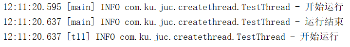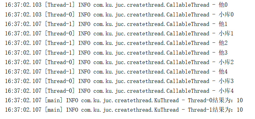 Callable ct1 = new CallableThread("小库"); Callable ct2 = new CallableThread("他"); FutureTask<Integer> ft1 = new FutureTask<Integer>(ct1); FutureTask<Integer> ft2 = new FutureTask<Integer>(ct2); Thread t1 = new Thread(ft1); Thread t2 = new Thread(ft2); t1.start(); t2.start(); log.info(t1.getName()+"结果为:"+ft1.get()); log.info(t2.getName()+"结果为:"+ft2.get()); //上面是测试类 class CallableThread implements Callable<Integer>{ Logger log = LoggerFactory.getLogger(CallableThread.class); private String name; public CallableThread(String name) { this.name = name; } @Override public Integer call() throws Exception { Integer sum = 0; for (int i = 0; i < 5 ; i++) { sum += i; log.info(this.name +i); } return sum; } }