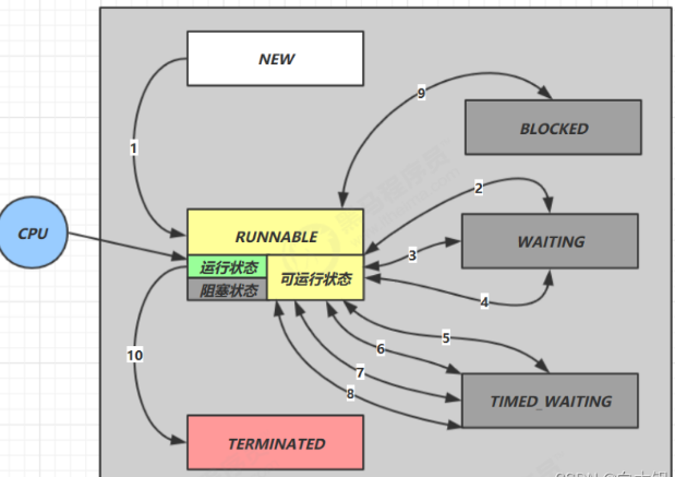 上图中将Runnable与Running合并了,当创建一个线程对象的时候就是new状态、当我们调用start()方法时,线程就从new状态转变为了Runnable状态,调用run()方法之后就从Runnable状态转换为Running状态了,调用sleep()方法就进入了BLOCKED状态,当某线程获得使用synchronized获得锁后调用wait方法或者调用join()方法就进入了Waiting状态,调用wait(long mills)进入了Timed-waiting状态,最后执行完任务就进入了Terminated状态。