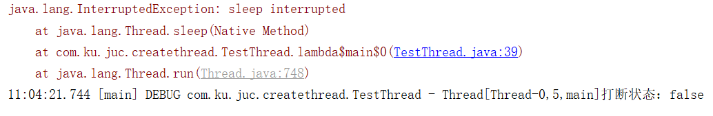 Thread t3 = new Thread(() -> { try { Thread.sleep(2000); } catch (InterruptedException e) { e.printStackTrace(); } }); t3.start(); Thread.sleep(1000); t3.interrupt(); log.debug(t3+"打断状态:{}", t3.isInterrupted());